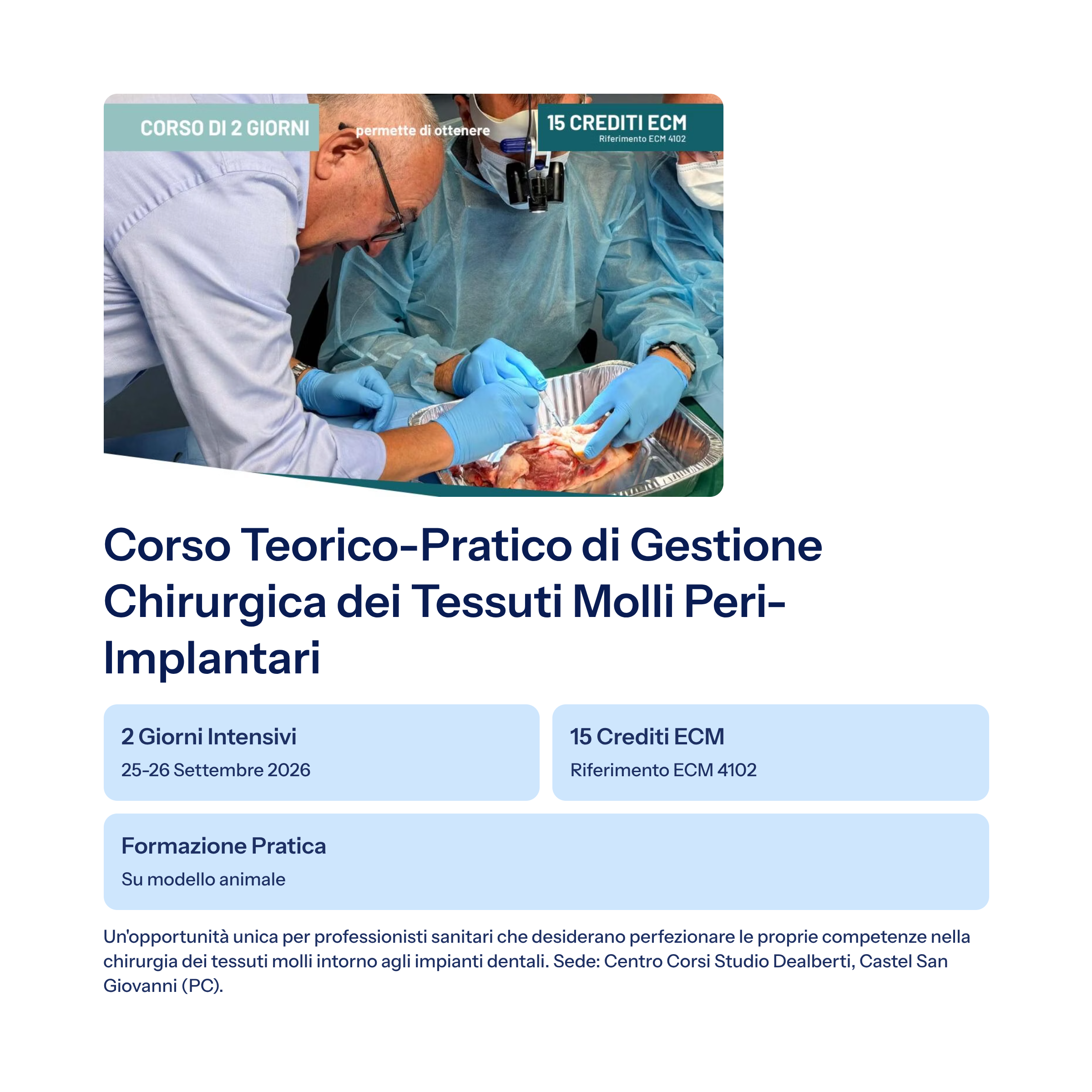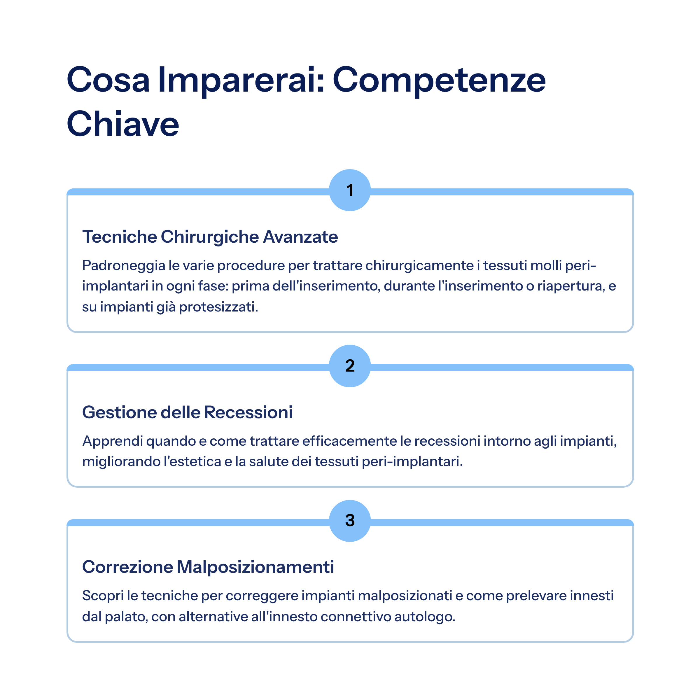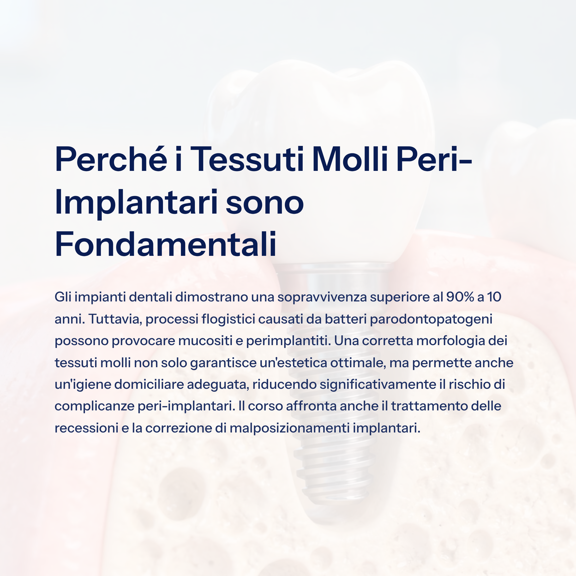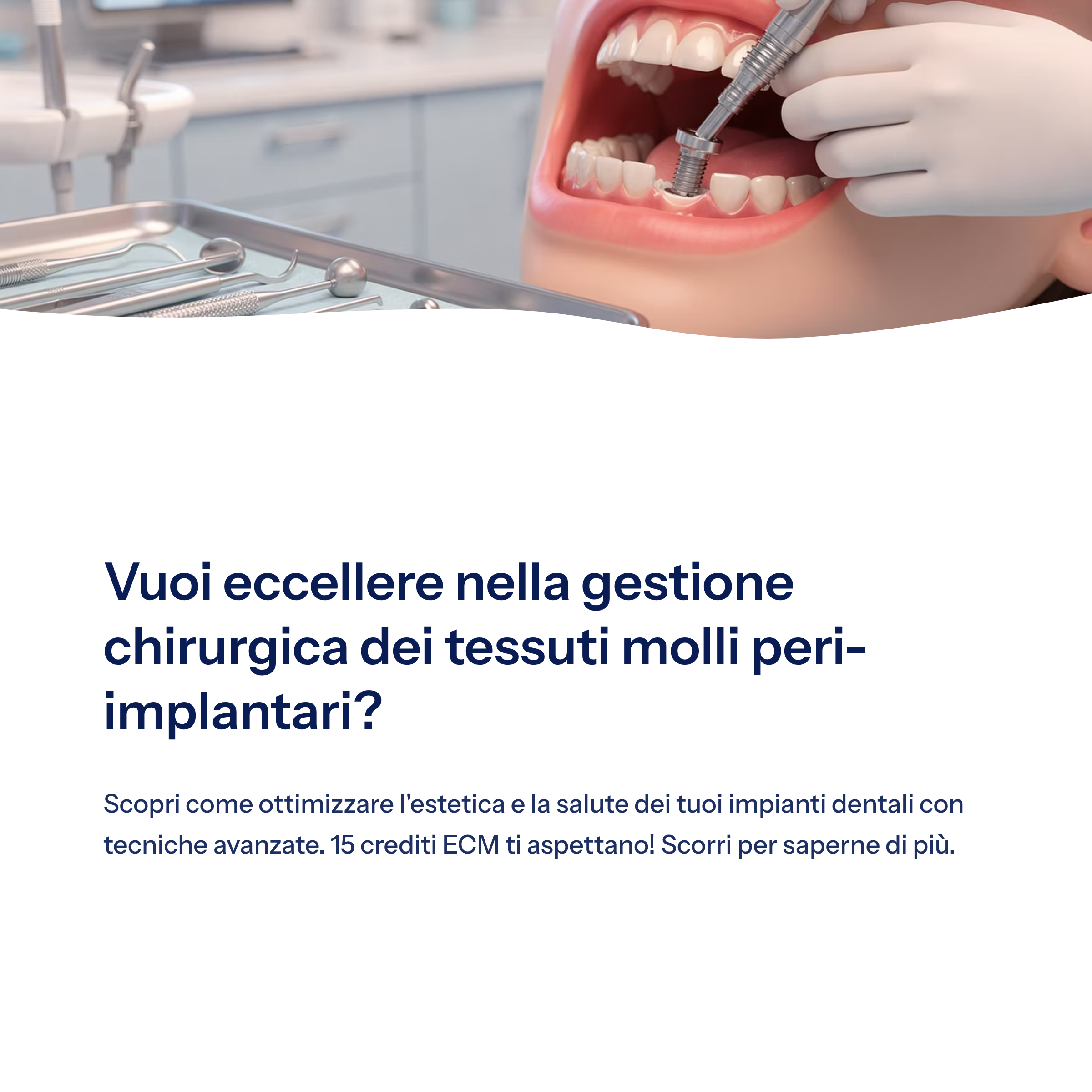 - Per conoscere le varie tecniche e procedure per trattare chirurgicamente i tessuti molli peri-implantari.