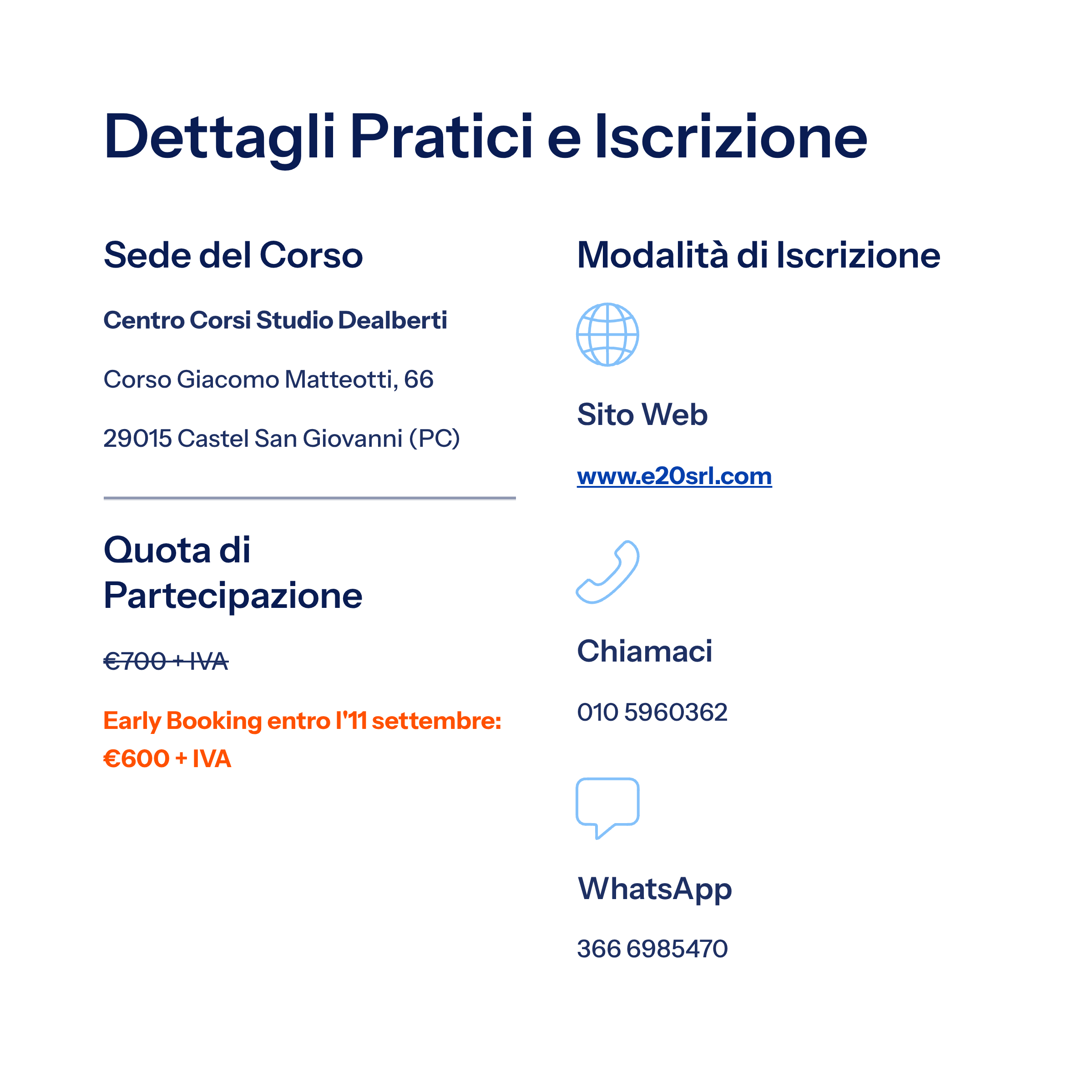 | Per coloro che hanno scelto il pagamento tramite bonifico bancario, si informa che essendo un corso pratico con posti limitati, l’iscrizione sarà considerata valida se seguita entro 5gg. dalla prenotazione, dalla contabile del pagamento. Diversamente, la prenotazione sarà automaticamente cancellata. |