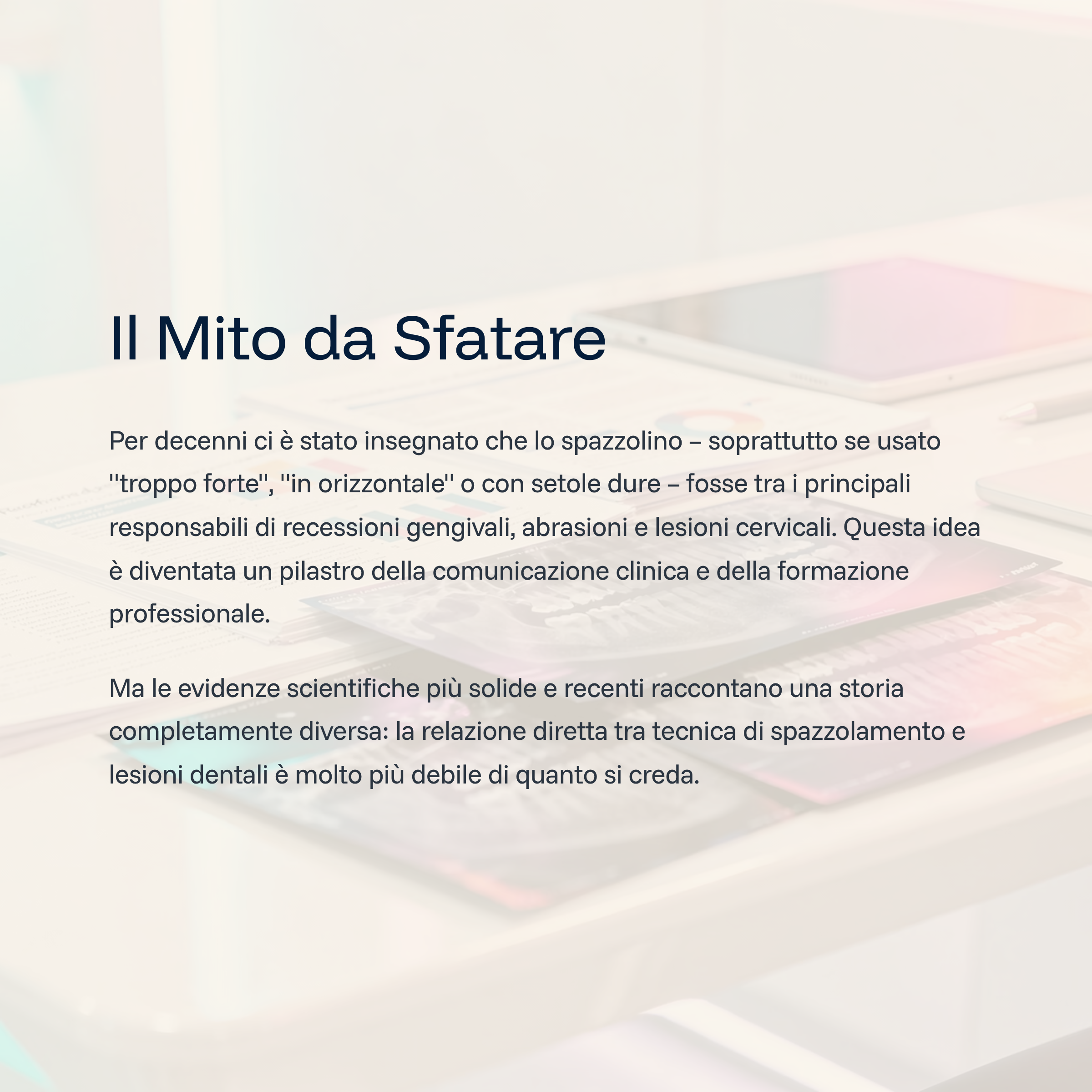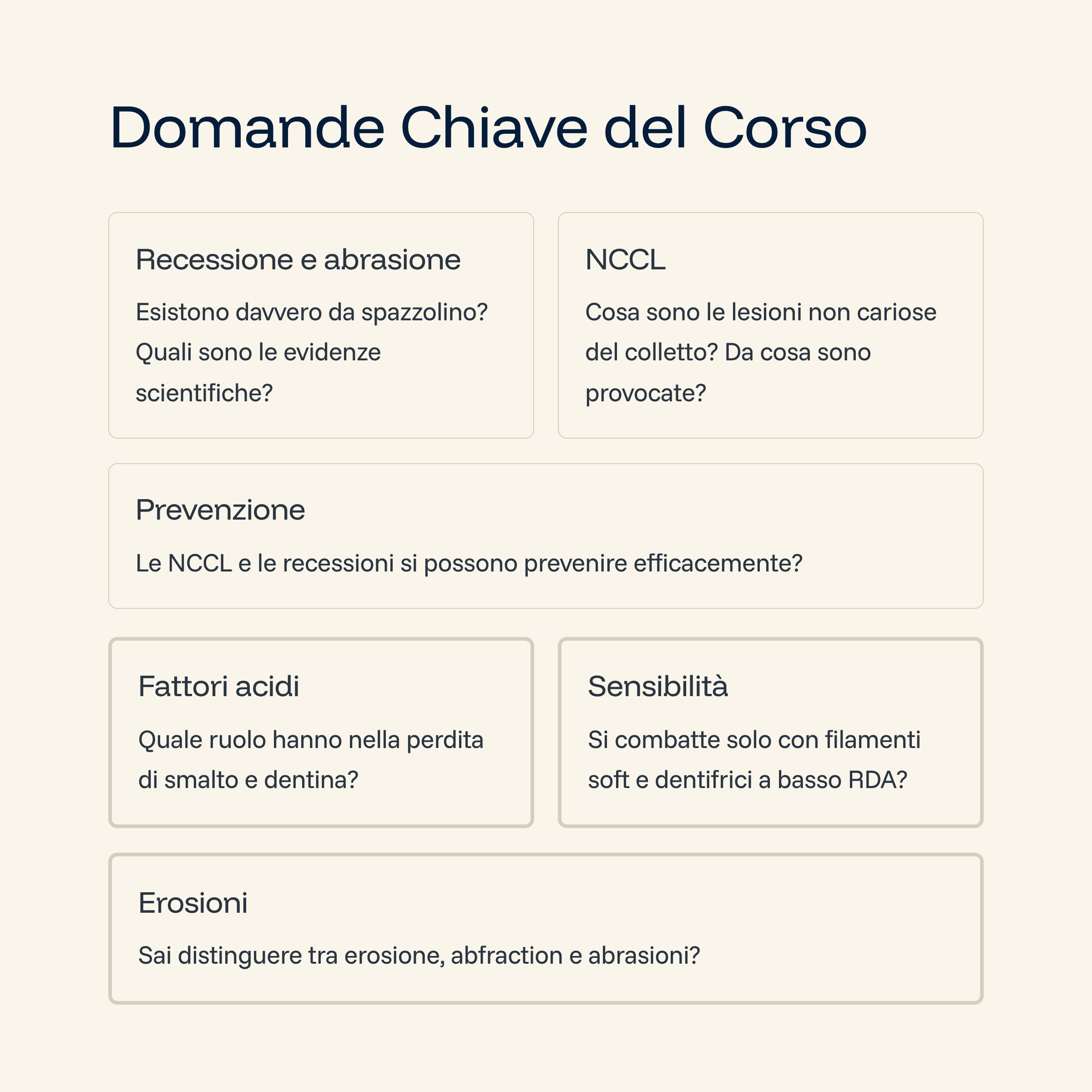 Impareremo a distinguere con precisione erosione, abfraction e abrasioni; a riconoscere i segni reali delle NCCL; e a comprendere quali evidenze supportino – o confutino – il ruolo dello spazzolino e del dentifricio in queste condizioni.