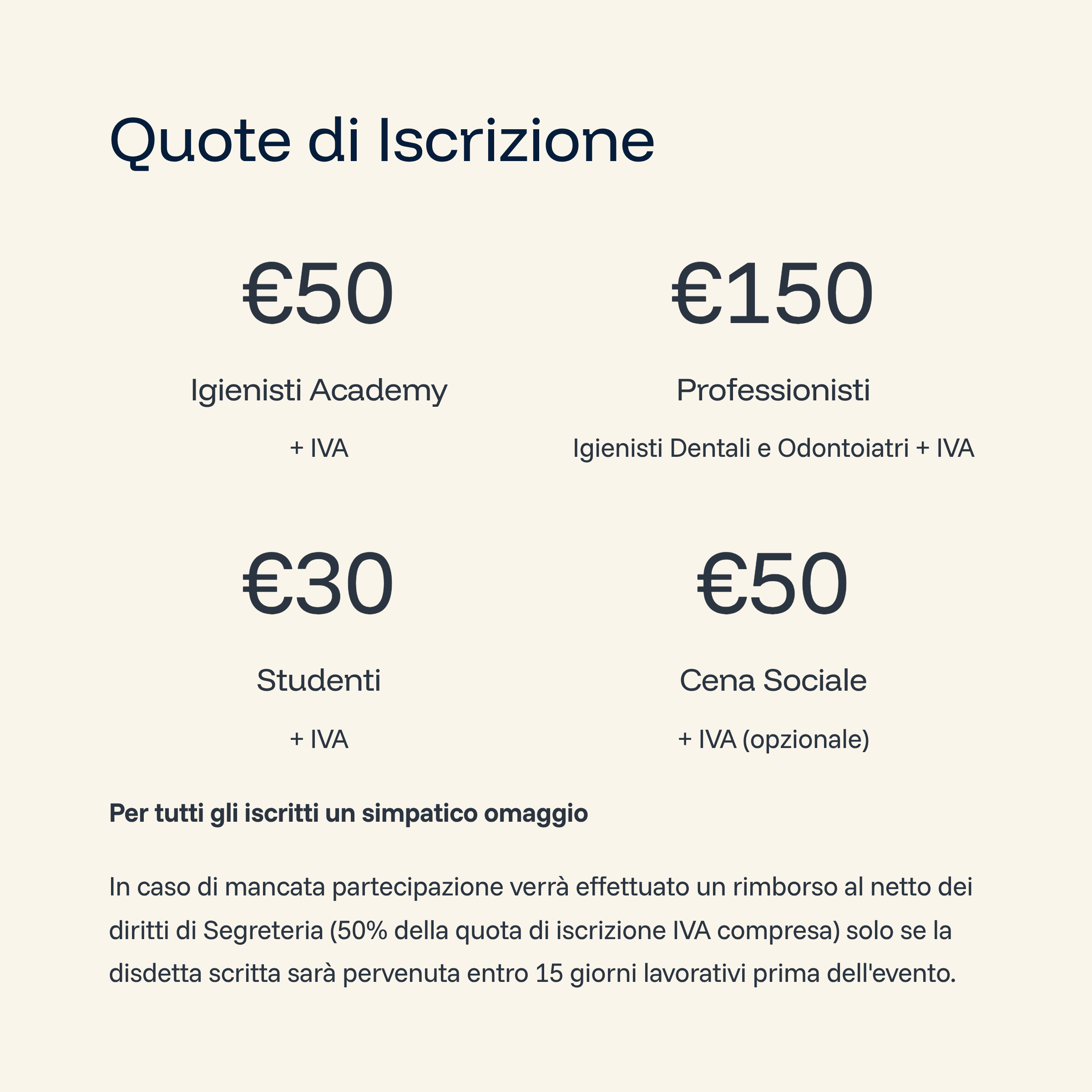 In caso di mancata partecipazione verrà effettuato un rimborso al netto dei diritti di Segreteria (50% della quota di iscrizione iva compresa) solo se la disdetta scritta sarà pervenuta alla Segreteria entro e non oltre 15 giorni lavorativi prima dallo svolgimento dell’evento per comprovati motivi. Le iscrizioni saranno ritenute valide solo se accompagnate dalla quota di iscrizione o dalla ricevuta del bonifico.