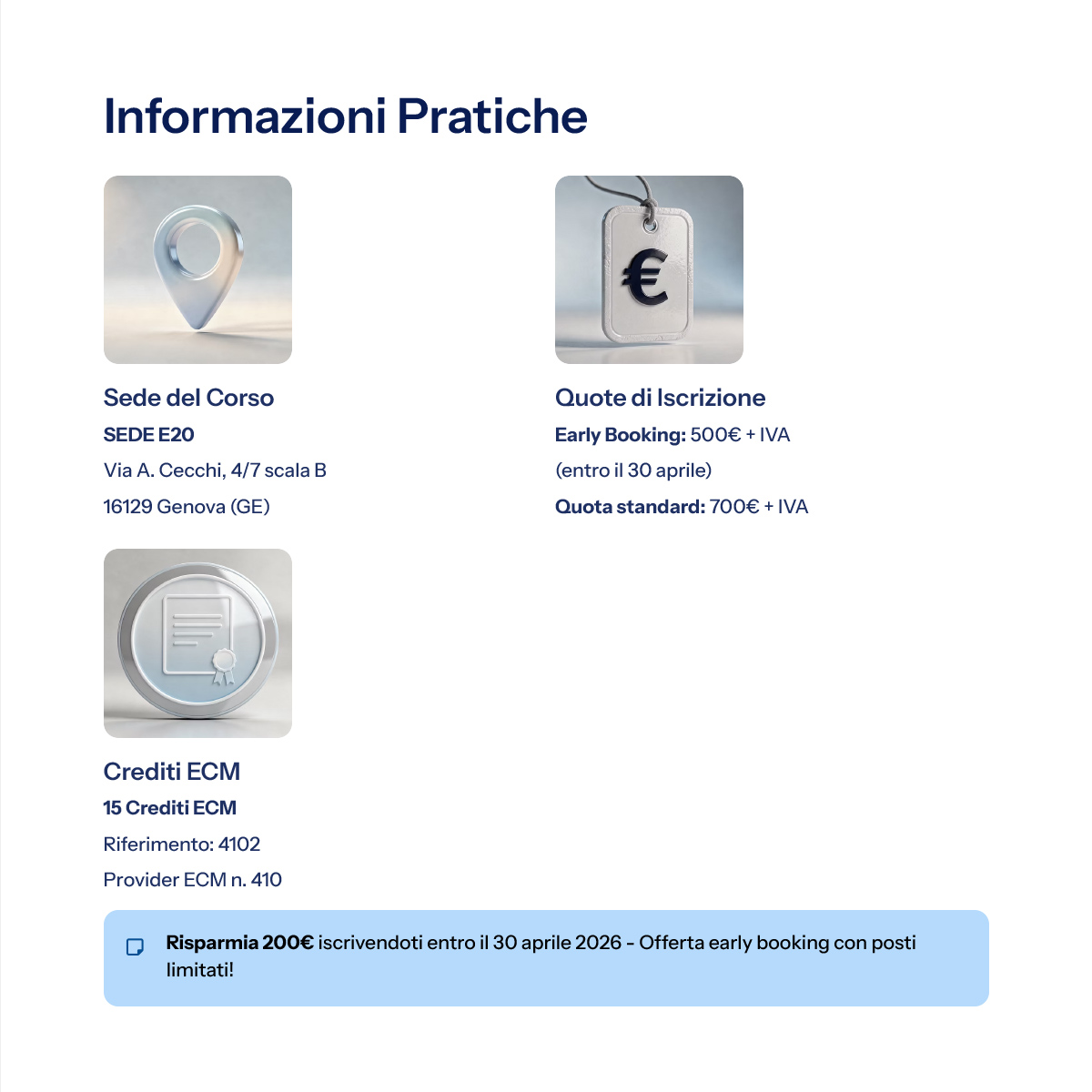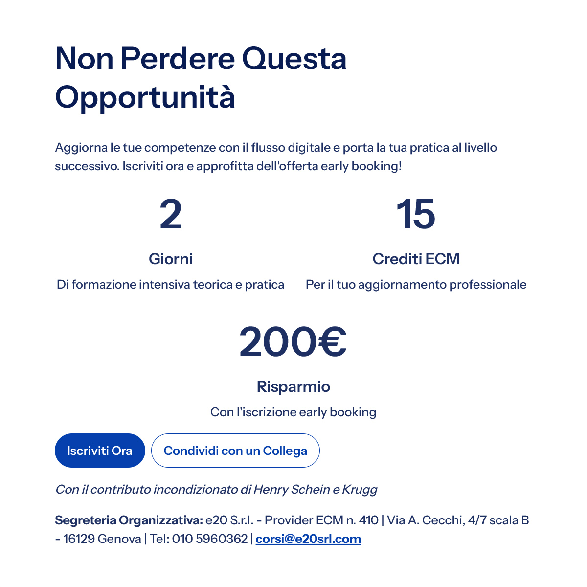 Il flusso digitale offre inoltre grandi vantaggi in termini di possibilità di diagnosi multidiscilplinare, elemento di forza qualora si debbano affrontare casi clinici complessi multidisciplinari. Questo corso ha l’obiettivo di introdurre un protocollo di scansione su elementi dentali naturali ed impianti e mostrare come una strategia digitale ci consenta di orientare in modo predicibile un piano di trattamento combinando trattamenti che coinvolgono diverse discipline del mondo odontoiatrico.
