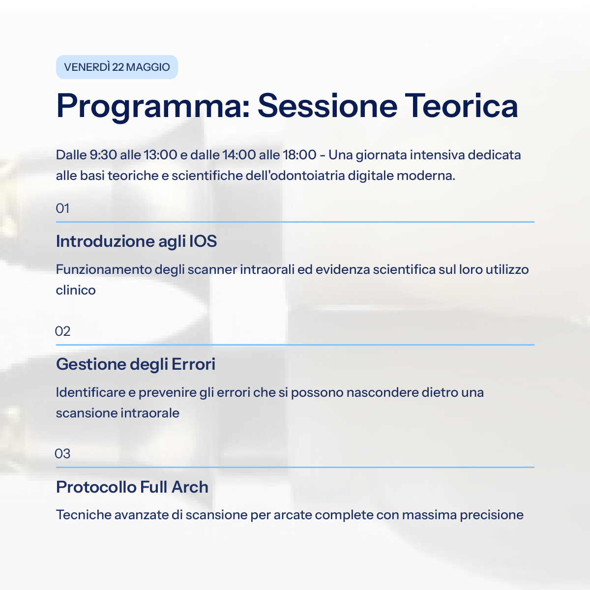 Il flusso digitale offre inoltre grandi vantaggi in termini di possibilità di diagnosi multidiscilplinare, elemento di forza qualora si debbano affrontare casi clinici complessi multidisciplinari. Questo corso ha l’obiettivo di introdurre un protocollo di scansione su elementi dentali naturali ed impianti e mostrare come una strategia digitale ci consenta di orientare in modo predicibile un piano di trattamento combinando trattamenti che coinvolgono diverse discipline del mondo odontoiatrico.