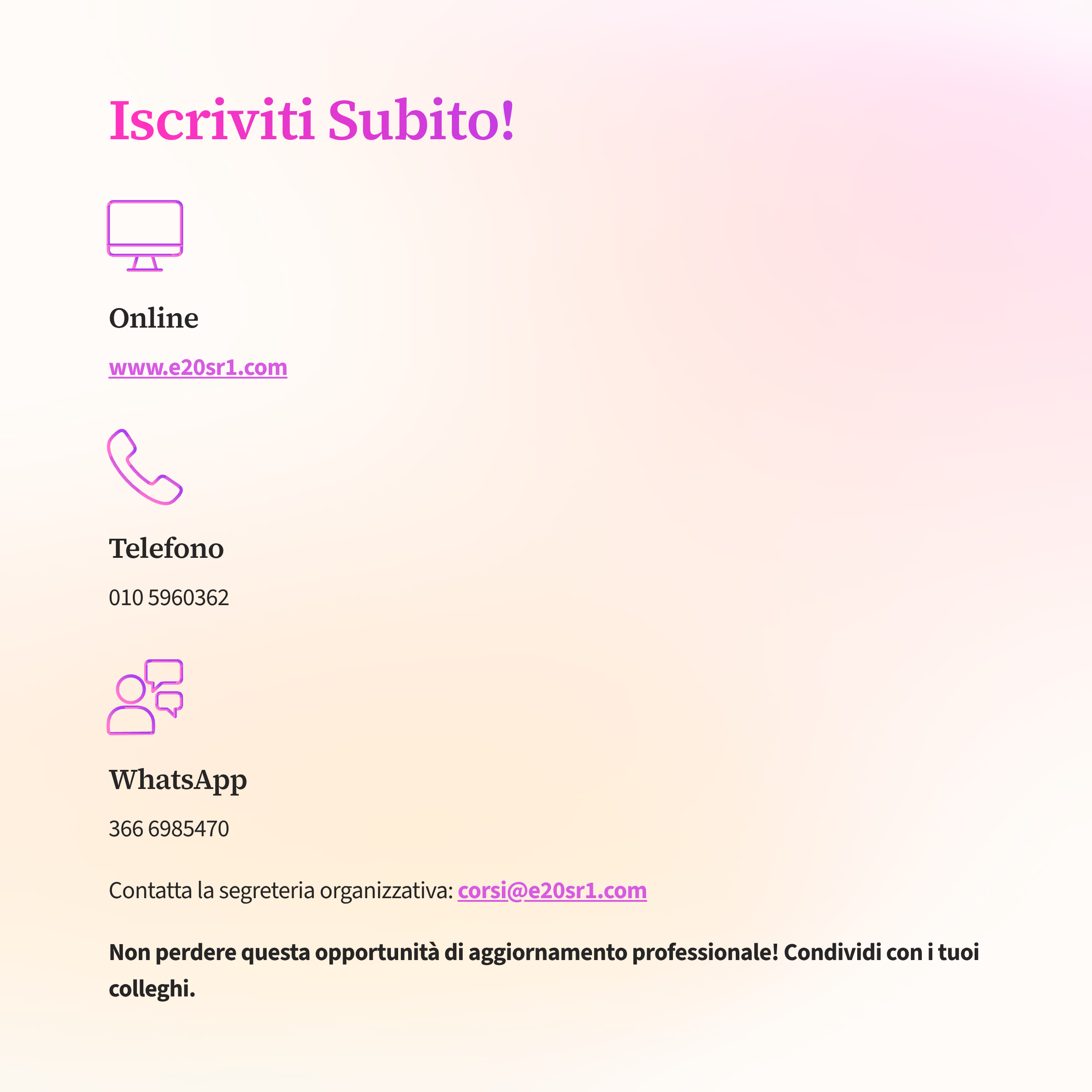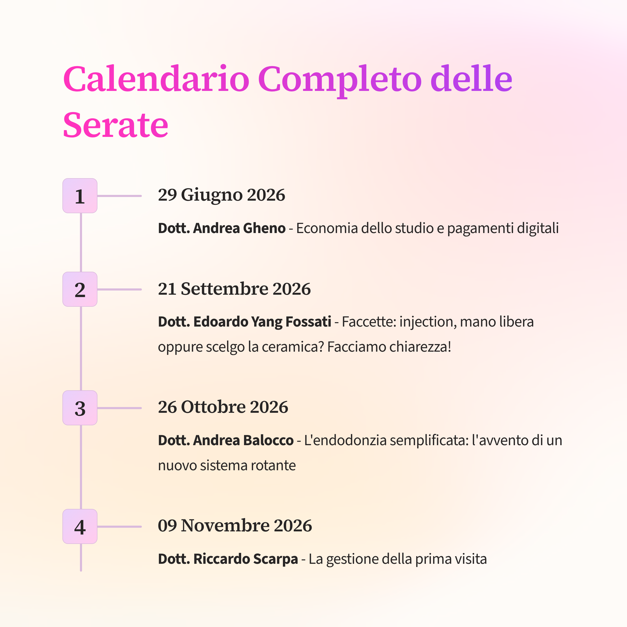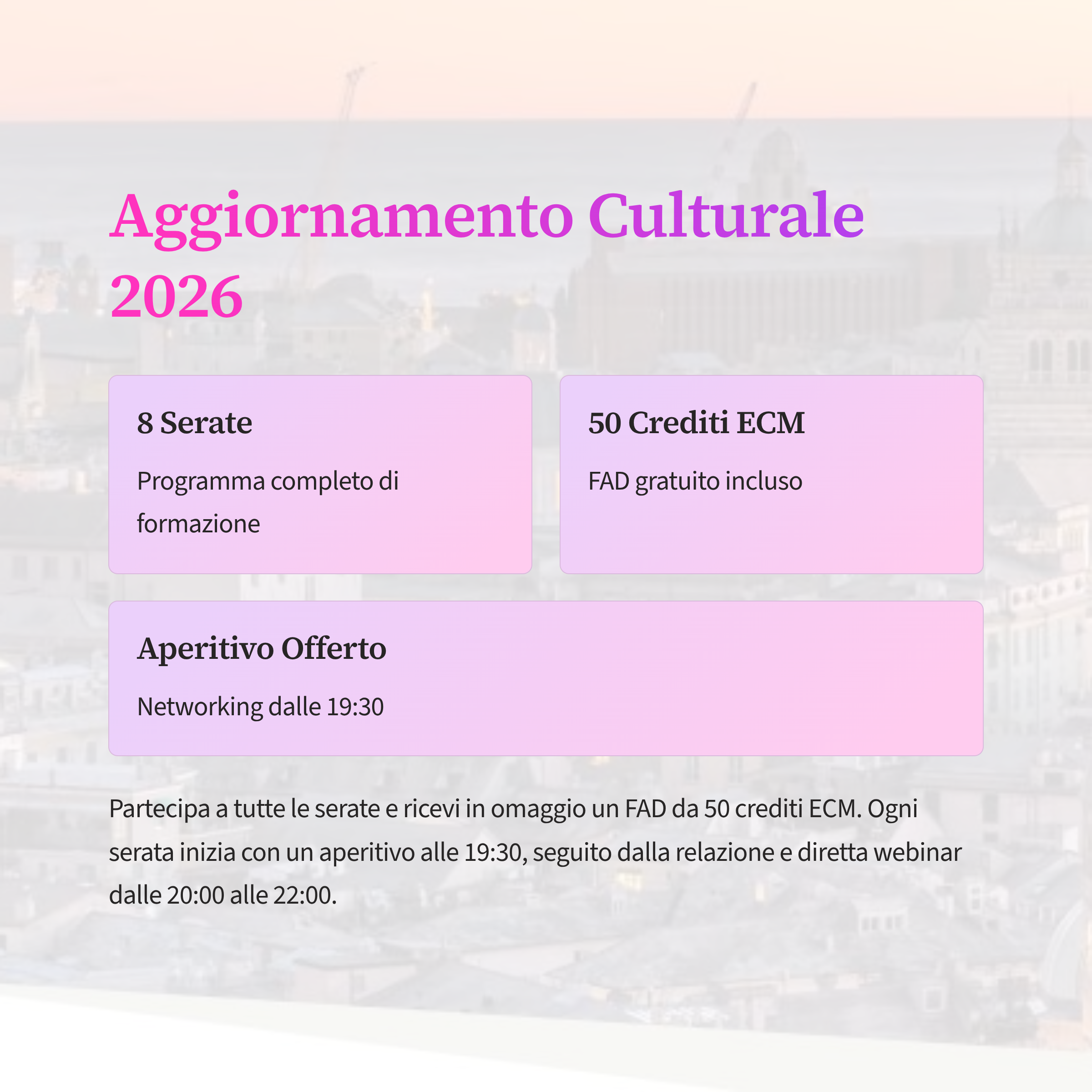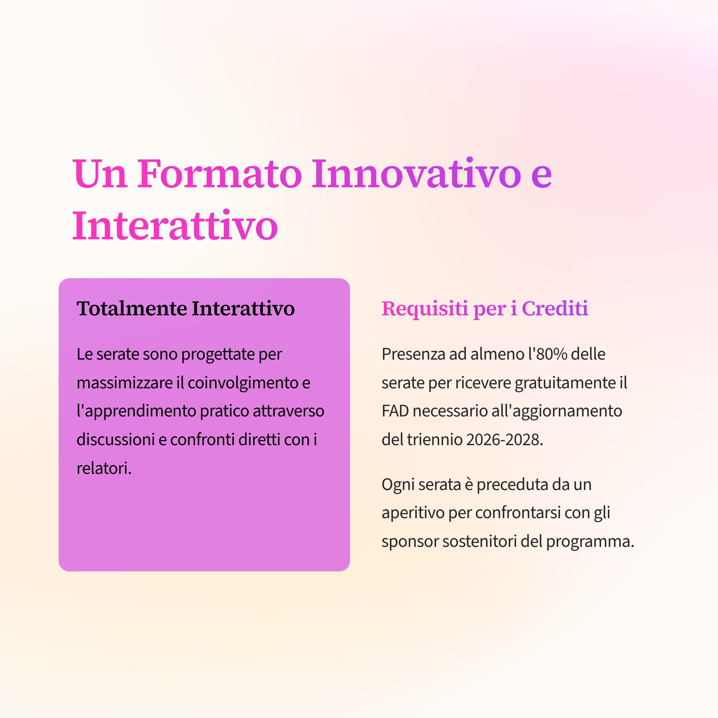 Le serate saranno totalmente interattive ed attraverso la presenza ad almeno l’80% daranno la possibilità di ricevere gratuitamente un FAD per ottenere i 50 crediti necessari all’aggiornamento del triennio 26-28.