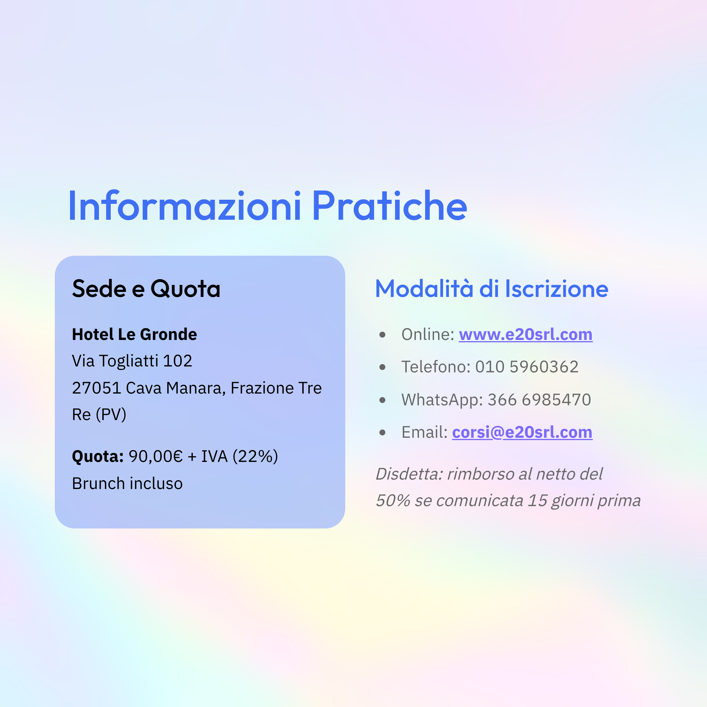 In caso di mancata partecipazione verrà effettuato un rimborso al netto dei diritti di Segreteria (50% della quota di iscrizione iva compresa) solo se la disdetta scritta sarà pervenuta alla Segreteria entro e non oltre 15 giorni lavorativi prima dallo svolgimento dell’evento per comprovati motivi. Le iscrizioni saranno ritenute valide solo se accompagnate dalla quota di iscrizione o dalla ricevuta del bonifico.