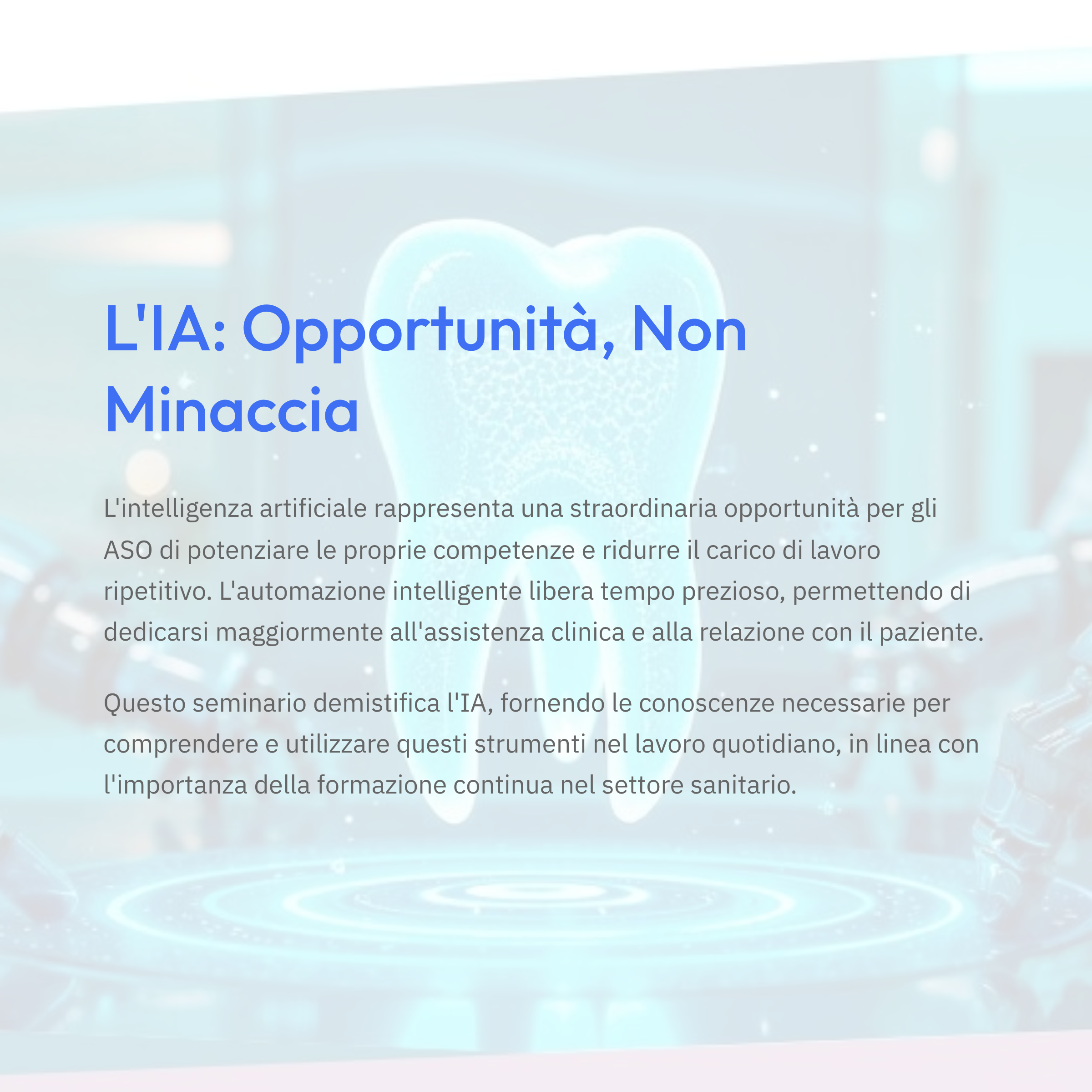 All’interno del team odontoiatrico, l’Assistente di Studio Odontoiatrico (ASO) ricopre un ruolo cruciale e poliedrico, che sta evolvendo di pari passo con l’introduzione di nuove tecnologie. L’adozione dell’Intelligenza Artificiale non deve essere percepita come una minaccia, bensì come una significativa opportunità per gli ASO. L’IA può infatti consentire loro di potenziare le proprie competenze, ridurre il carico di lavoro legato a mansioni ripetitive e amministrative, e contribuire in modo ancora più efficace al successo dello studio e alla qualità dell’esperienza del paziente. L’automazione intelligente di alcune attività può liberare tempo prezioso, permettendo all’ASO di dedicarsi maggiormente all’assistenza clinica e alla relazione con il paziente, aspetti fondamentali del suo ruolo. Questo seminario si propone di demistificare l’IA, fornendo agli ASO le conoscenze e la fiducia necessarie per comprendere e utilizzare questi nuovi strumenti nel loro lavoro quotidiano, in linea con l’importanza della formazione continua e dell’aggiornamento professionale nel settore sanitario. La crescente disponibilità di strumenti AI focalizzati sulla gestione operativa (come software per appuntamenti, comunicazione automatizzata, gestione documentale) rende questa tecnologia immediatamente applicabile e vantaggiosa per le mansioni quotidiane dell’ASO, che includono ampiamente queste aree.