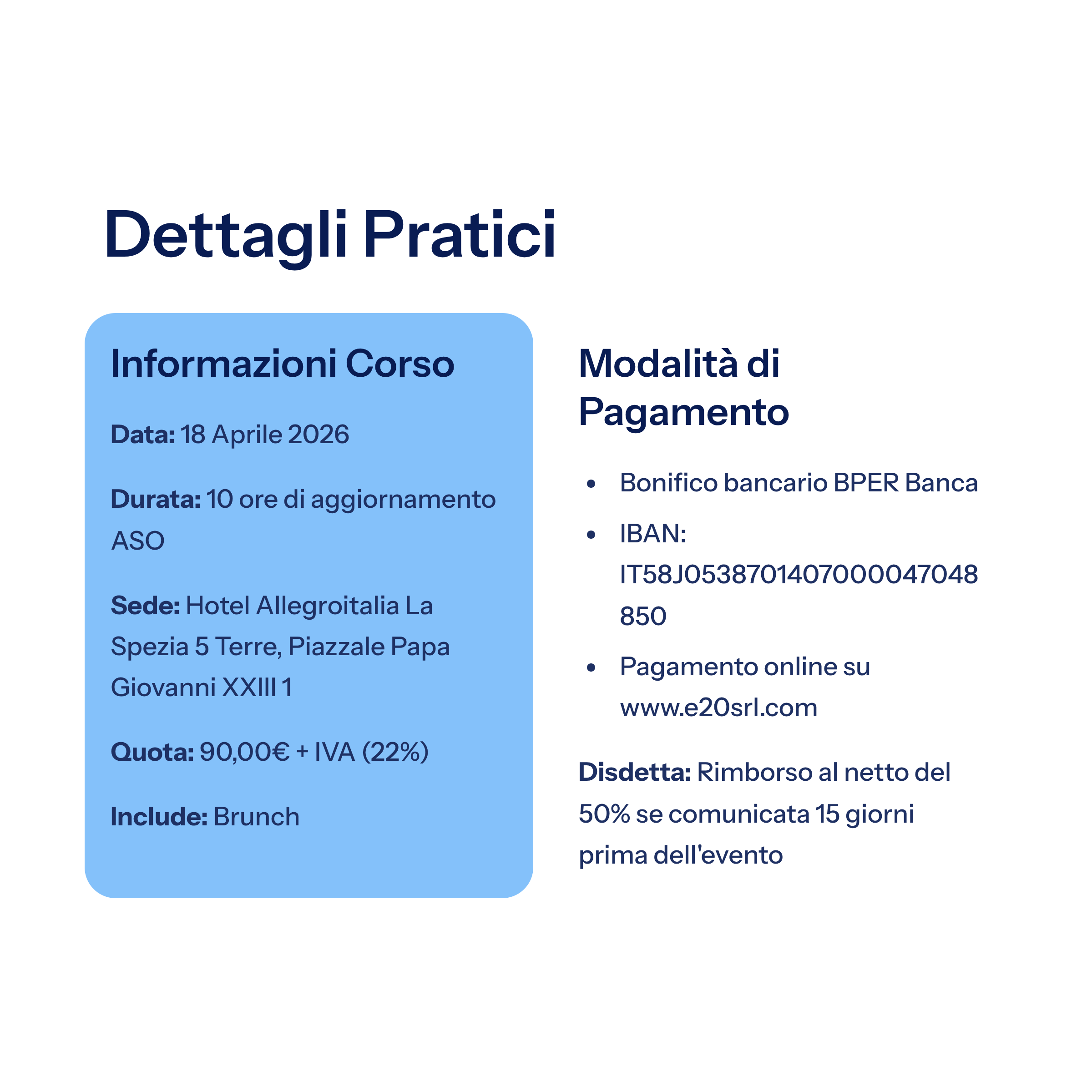 | Per coloro che hanno scelto il pagamento tramite bonifico bancario, si informa che essendo un corso pratico con posti limitati, l’iscrizione sarà considerata valida se seguita entro 5gg. dalla prenotazione, dalla contabile del pagamento. Diversamente, la prenotazione sarà automaticamente cancellata. |