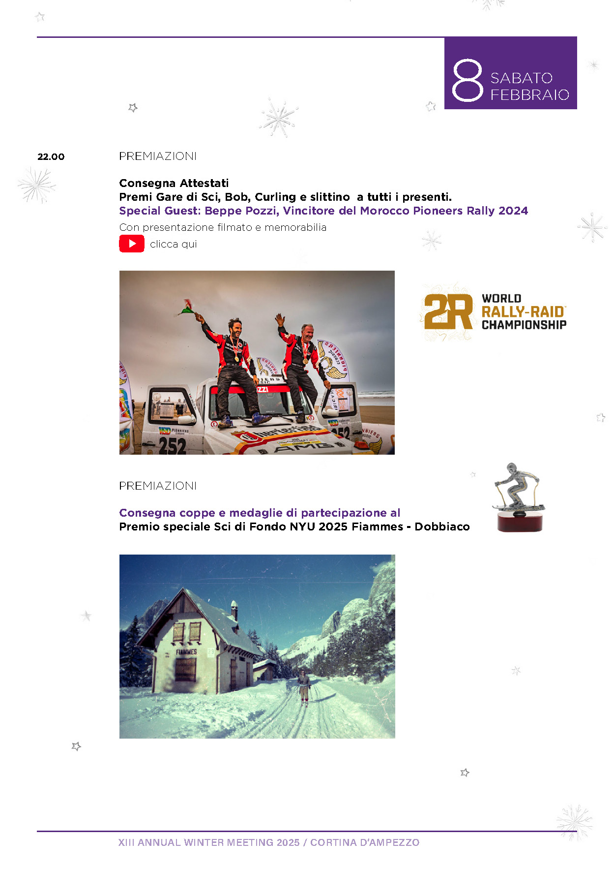| 22.00 | PREMIAZIONI: Consegna Attestati Premi Gare di Sci, Bob, Curling e slittino a tutti i presenti. Special Guest: Beppe Pozzi, Vincitore del Morocco Pioneers Rally 2024 |